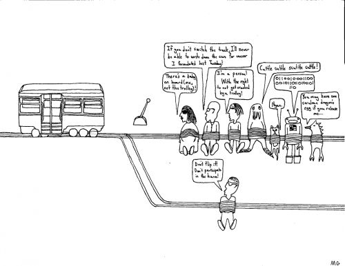 Romy wulfsohn first year postgraduate llb student, school of law, university of the witwatersrand developed by philipa foot and expanded on by thomson, the so called ‘trolley problem’ has haunted inquiring minds, especially those of philosophers and jurists, for years. The broader issue (which applies to all moral theories across the board and is not particular to any model, whether game theory or trolley) of what we do with “unknowable cases” (decisions we are unaware we are making or have no information pertaining to the differential outcomes and can’t get any in time) i address in my chapter on moral. And as anticipated, we do not try to solve the trolley problem.